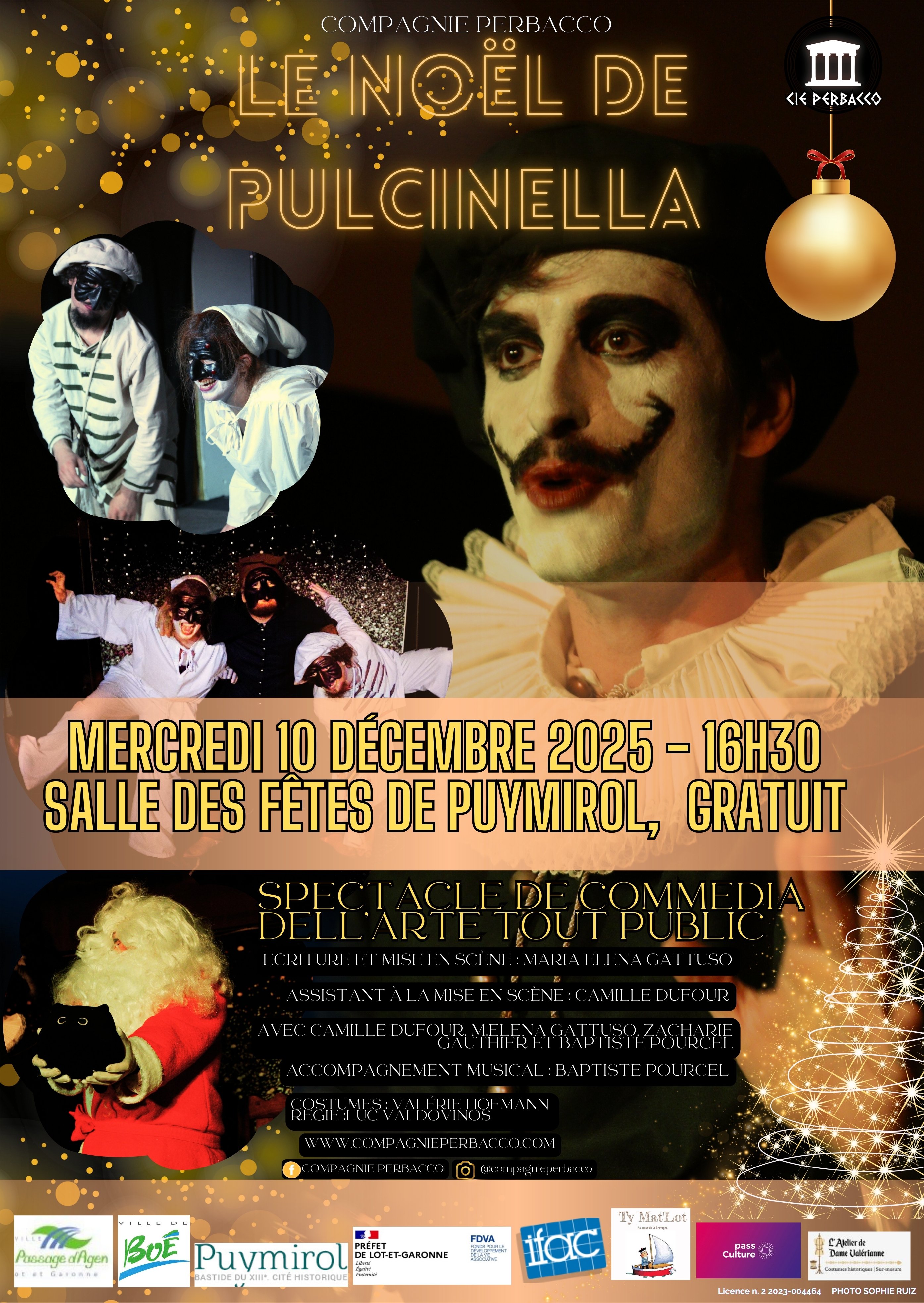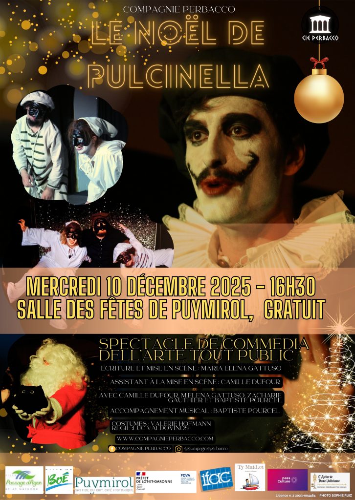 Après nos tournées de 2023 et 2024, « Le Noël de Pulcinella », spectacle de Commedia dell’Arte tout public, revient cette année à la salle des fêtes de Puymirol.