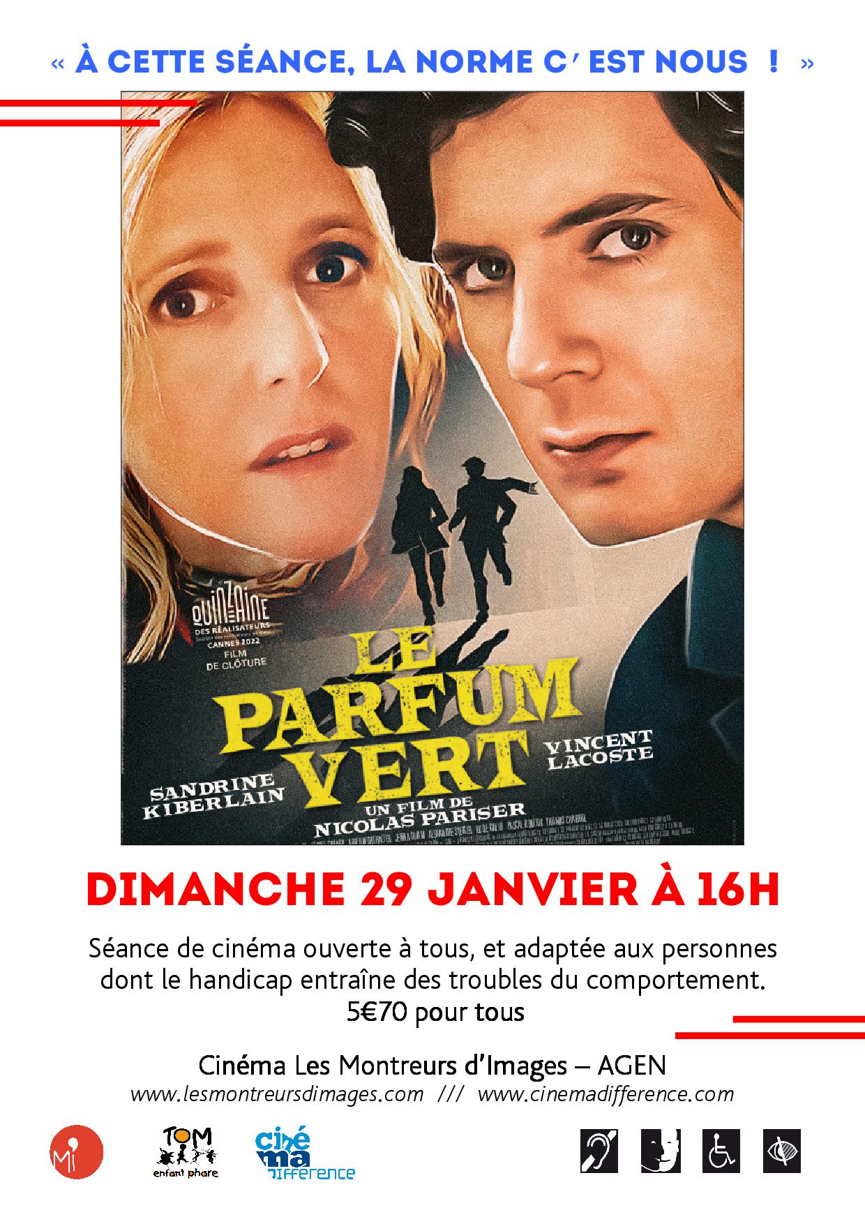 Dimanche 29 janvier à 16h, en partenariat avec Tom Enfant Phare et Culture Relax, nous vous proposons « Le Parfum Vert » de Nicolas Pariser lors d’une séance de cinéma ouverte à tous et adaptée aux personnes dont le handicap entraîne des troubles du comportement, 5.70€ pour tous.