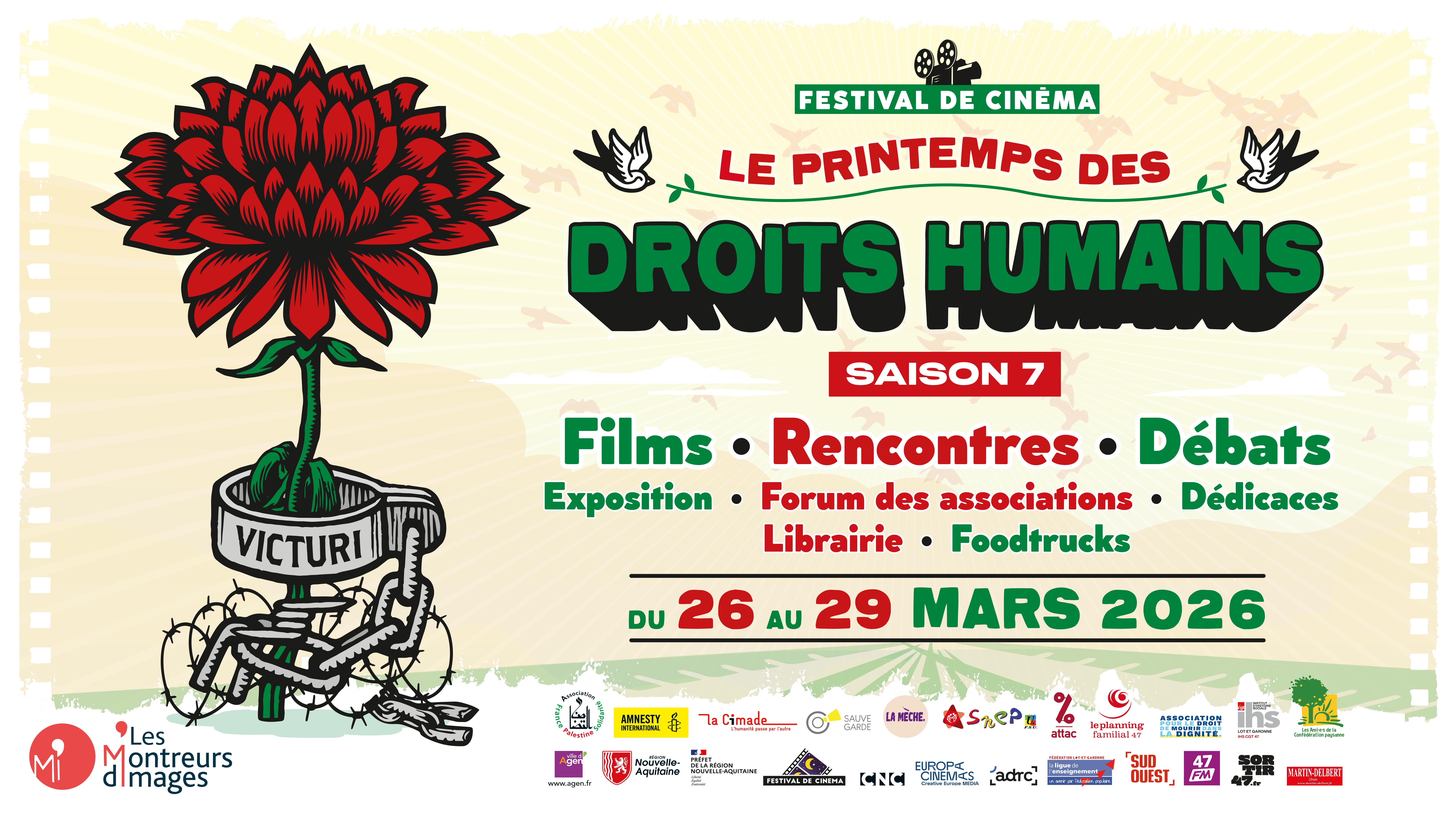Face à la réalité de l’état des droits humains que le cinéma nous révèlera, nos rencontres, nos échanges et nos débats devront nous (re)donner confiance dans l’espoir d’un monde nouveau, à l’instar de ce qu’est le printemps. C’est en tous les cas notre objectif résumé en un mot : VICTURI. En latin, il a un double sens : ceux qui vont vivre ; ceux qui vont vaincre. En espérant que vous serez nombreux à vous y associer, pour que vivent et triomphent les Droits Humains.