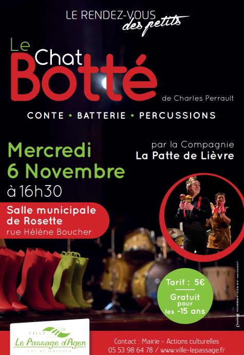 Le Chat Botté de Charles Perrault en version Conte/Batterie/Percussions par la Compagnie La Patte de Lièvre.