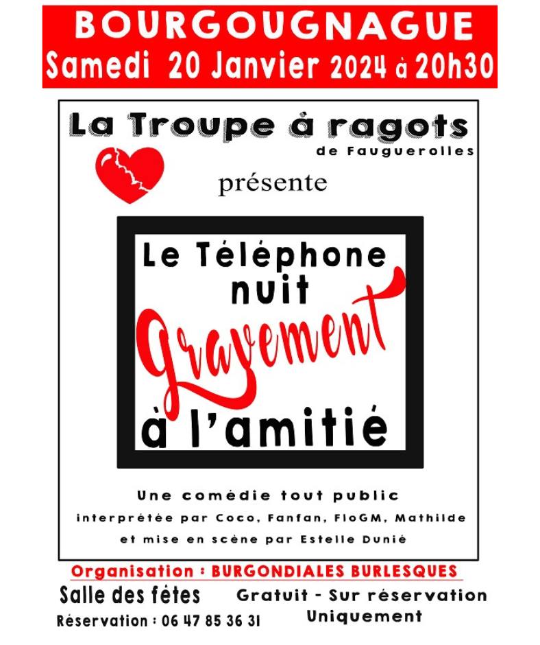 Soirée théâtre organisée par l’association Burgondiales Burlesques 2022 et la municipalité.Comédie tout public par la Troupe à Ragots de Fauguerolles.