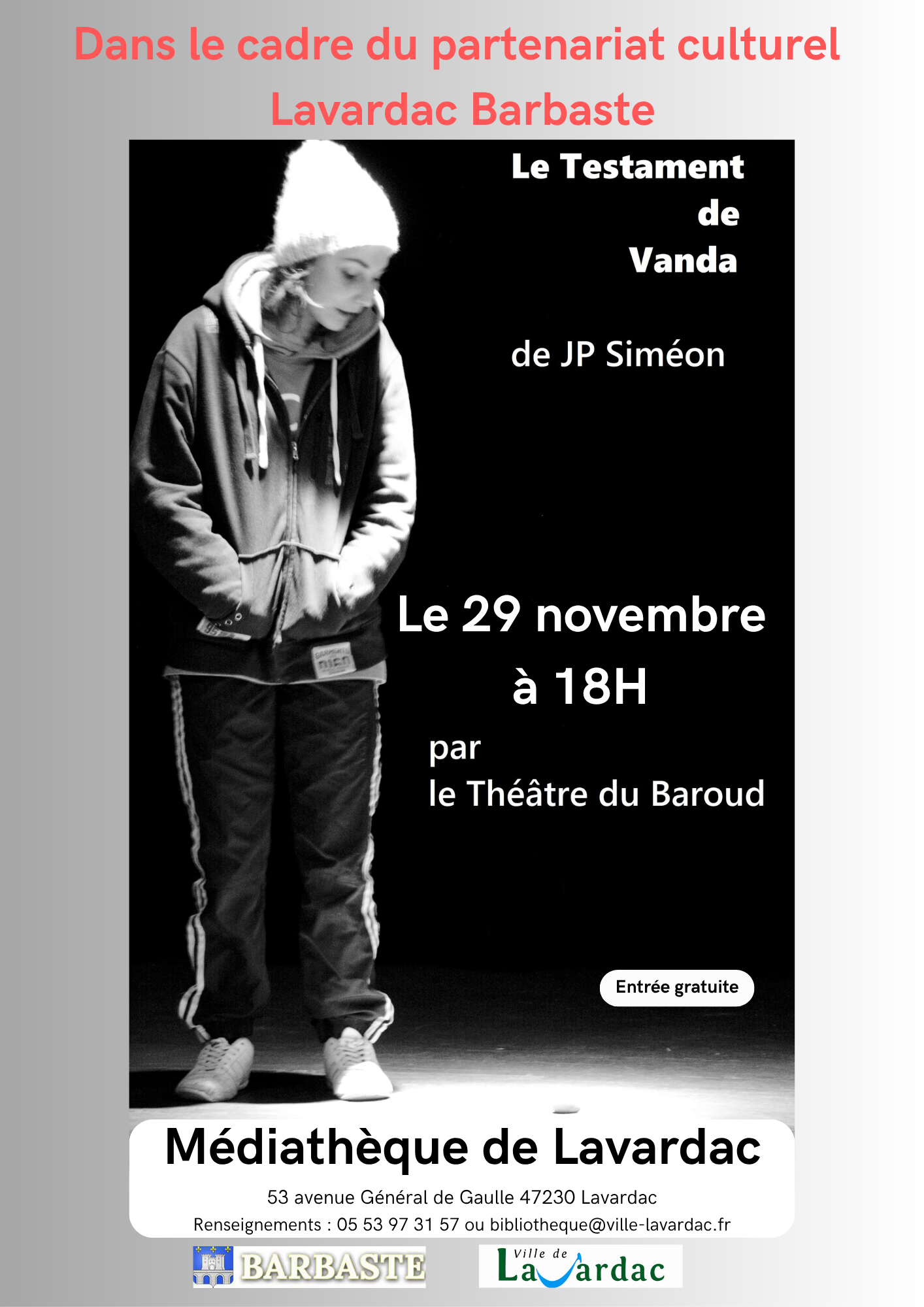 Dans le cadre du partenariat culturel Lavardac-Barbaste, le Théâtre du Baroud vous présente « Le Testament de Vanda ».