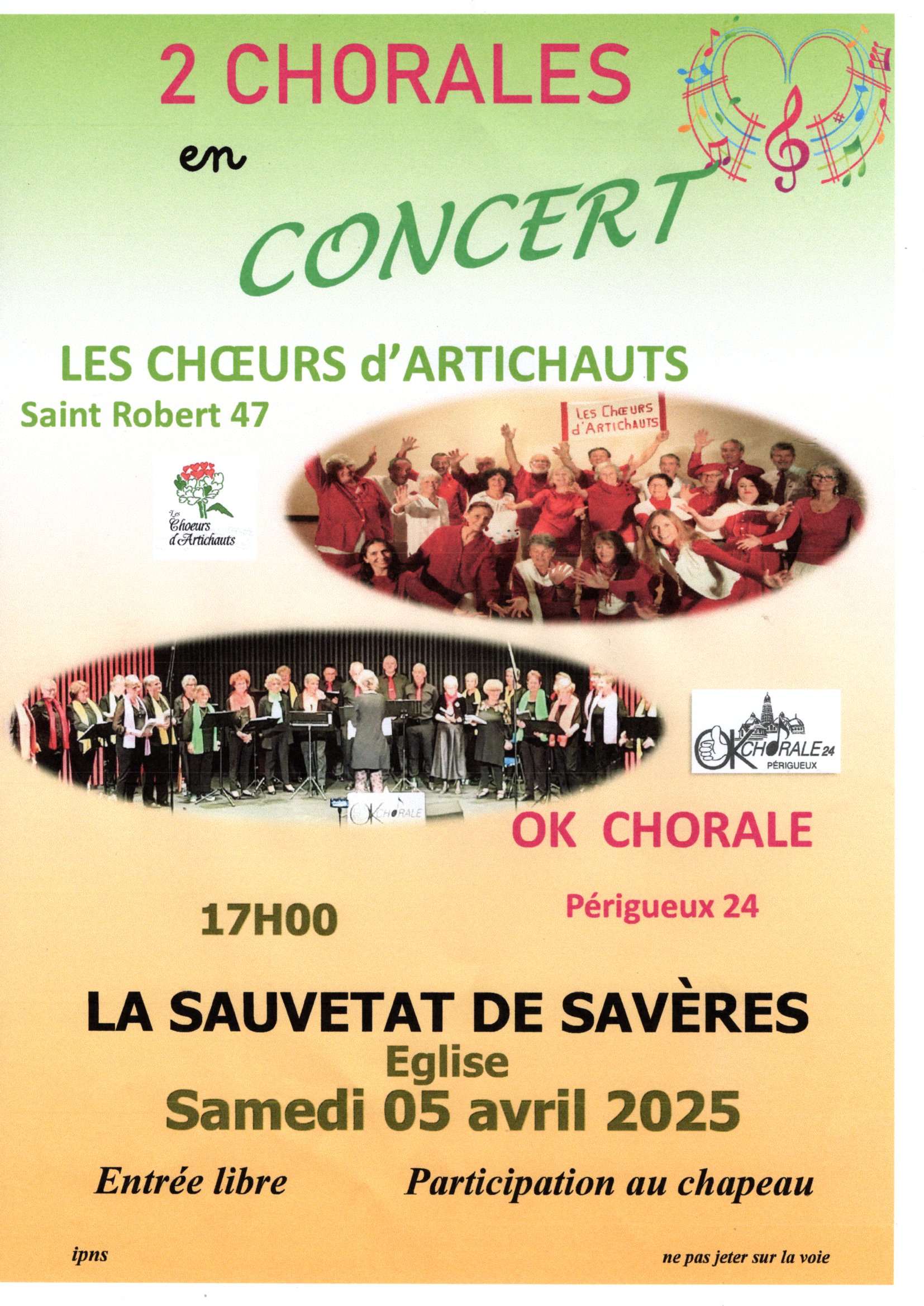 Les Chœurs d’Artichauts de Saint Robert accueillent le groupe vocal Ok Chorale 24 de Périgueux le samedi 5 Avril 2025 à 17h en l’église de La Sauvetat de Savères.