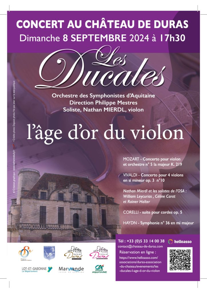 Bientôt notre rendez-vous annuel avec l’Orchestre des Symphonistes d’Aquitaine sous la direction de Philippe Mestres pour le concert des Ducales : l’Age d’or du violon. Soliste : Nathan Mierdl (premier violon-solo de l’Orchestre Philharmonique de Radio France). Au programme des oeuvres de Mozart (concerto pour violon et orchestre n°5 en la majeur K.219), Corelli (suite pour cordes op.5), Vivaldi (Sinfonia « la Fida Ninfa » RV 725) et Bach (concerto pour trois violons en ré majeur BW 1064R).