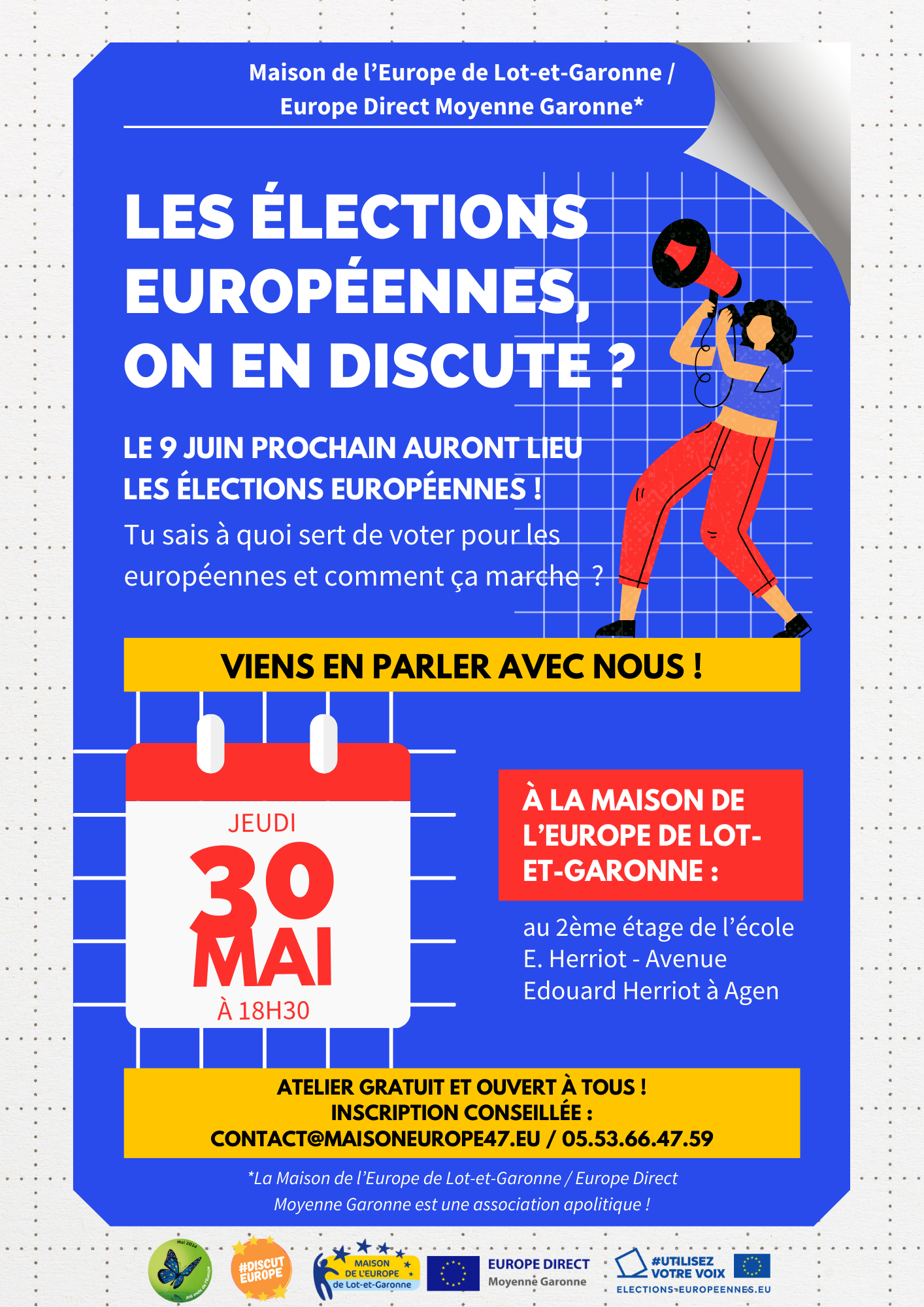 La Maison de l’Europe de Lot-et-Garonne / Europe Direct Moyenne Garonne organise un atelier d’information à propos des élections européennes, le jeudi 30 mai 2024 à 18h30 dans les locaux de la Maison de l’Europe de Lot-et-Garonne, avenue Edouard Herriot à Agen.