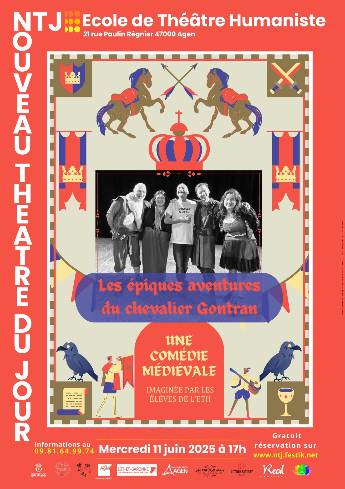 Gontran, jeune chevalier auvergnat, vit paisiblement avec sa douce Camomille. Une mission de la plus haute importance l’appelle d’urgence en terre agenaise. Accompagné de son fidèle écuyer, il bravera mille dangers pour arriver à sa destination finale : le Nouveau Théâtre du Jour…