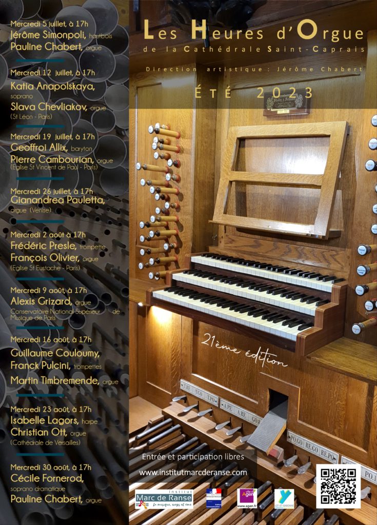 La 21ème édition des Heures d’Orgue de la Cathédrale Saint-Caprais d’Agen s’ouvrira le 5 juillet prochain, sous la direction artistique de Jérôme Chabert, directeur artististique de L’Institut Marc de Ranse et de l’Auditorium de Prayssas, pianiste et organiste titulaire de la cathédrale St Caprais d’Agen.