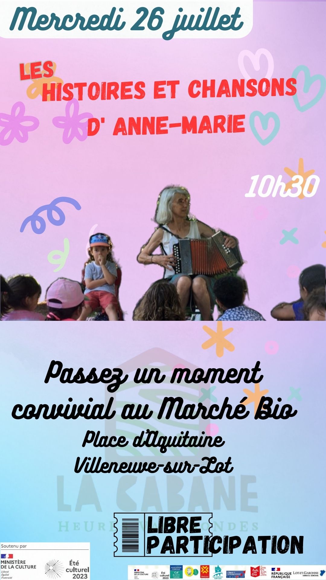 Spectacles Les Histoires et Chansons d’Anne-Marie Marché Bio - Villeneuve-sur-Lot Place d'Aquitaine Villeneuve-sur-Lot Voir tous les événements se déroulant ici le 26 juillet 2023 De 10h30 à 11h30 Familial Participation libre Site internet Page Facebook Contes et histoires. La Cabane - Heures Vagabondes 06 15 88 73 67 heuresvagabondes@gmail.com