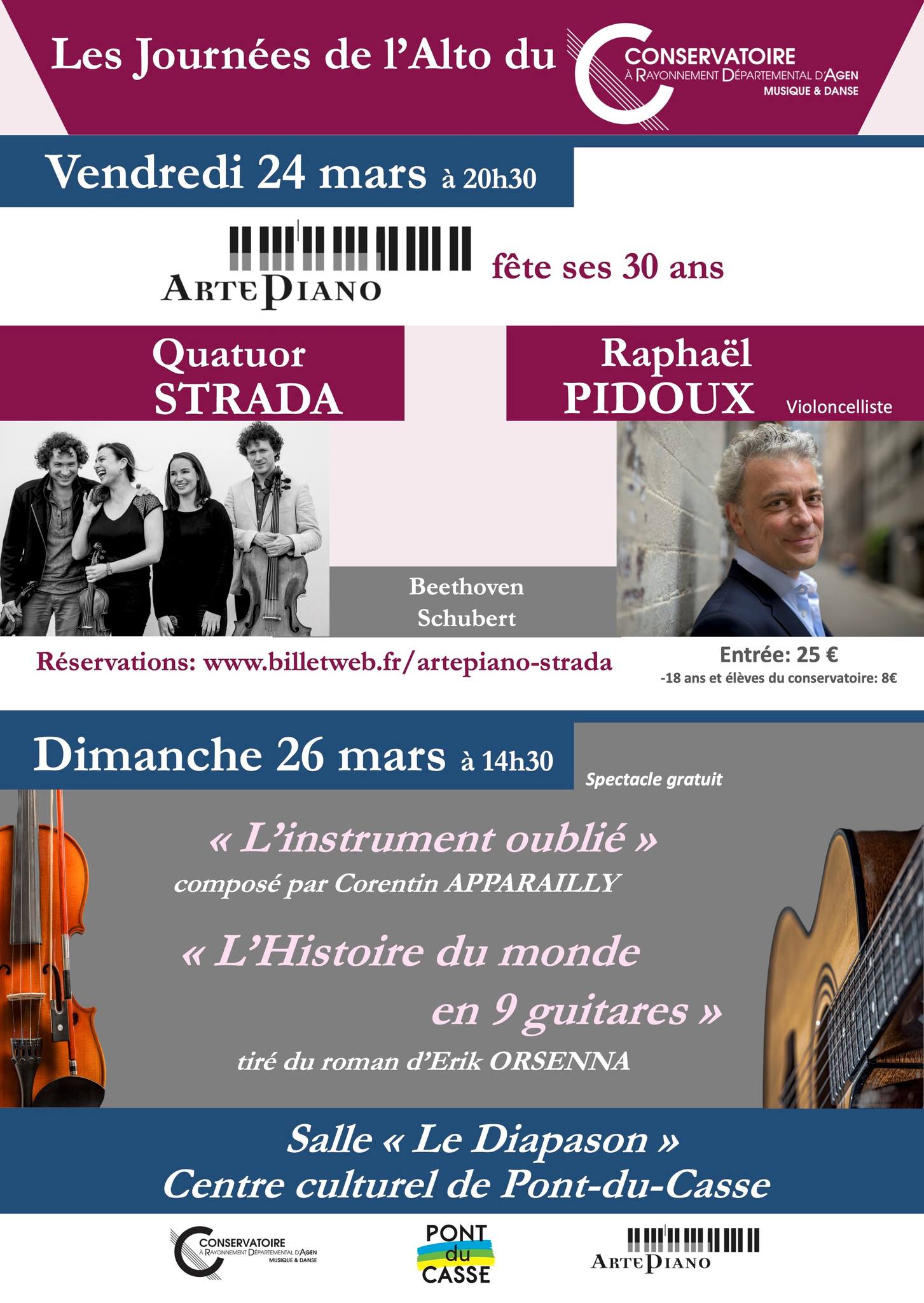 Vendredi 24 mars à 20h30Artepiano fête ses 30 ans !Concert du Quatuor Strada et de Raphaël Pidoux.Réservations : www.billetweb.fr/artepiano-strada