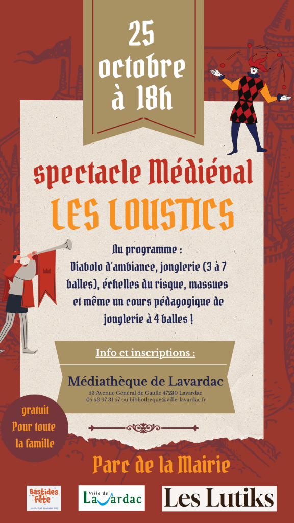 Deux drôles de Loustics viennent présenter leurs numéros de rue : diabolo d’ambiance, jonglerie 3, 4, 5, 6 et 7 balles, échelles du risque, massues.