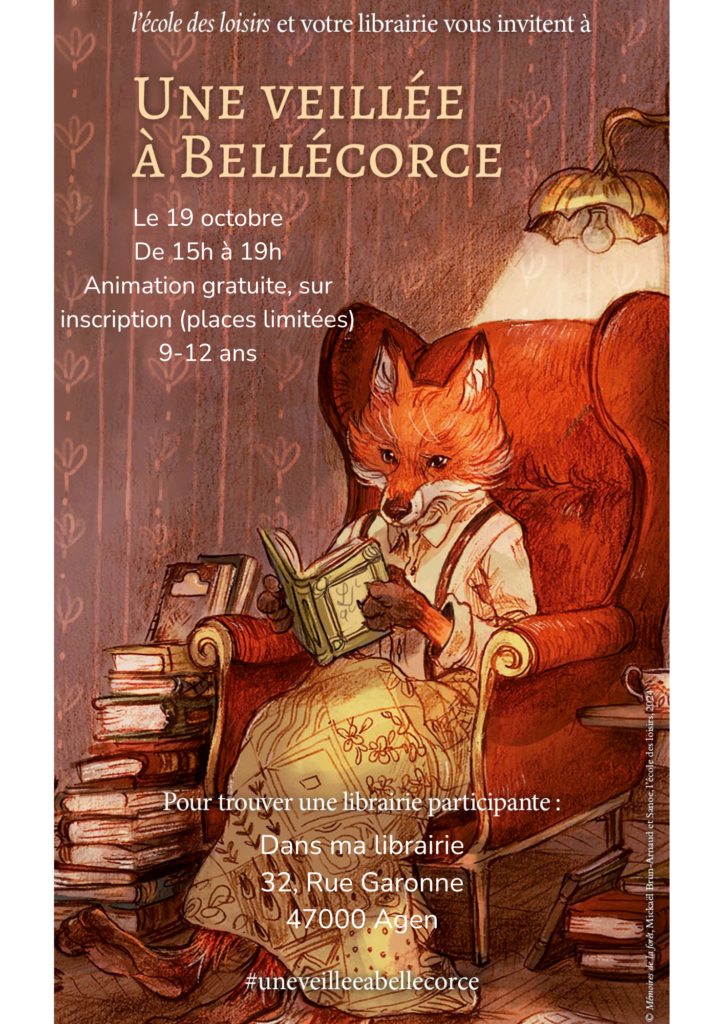 A cette occasion, les éditions Ecole des Loisirs organisent une animation nationale : Une veillée à Bellécorce, et nous avons la chance de faire partie des librairies choisies. Nous vous invitons donc à venir participer à une petite parenthèse enchantée en notre compagnie.