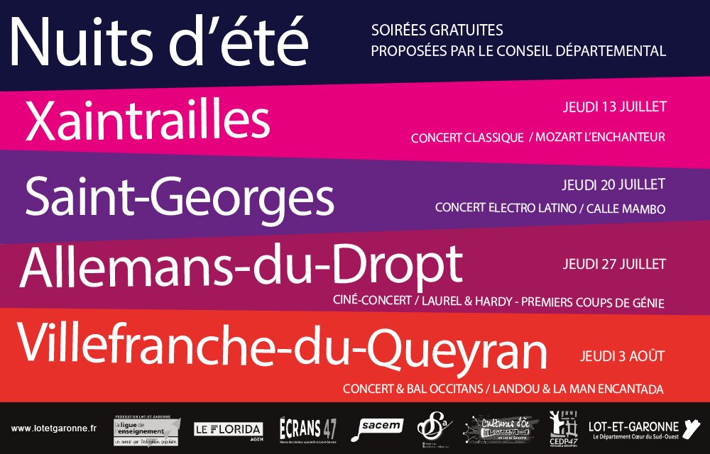 Elles sont concoctées par le Conseil départemental avec le concours du CEDP 47 Paysage & Médiation (balades découvertes), l’OSA, l’Adem-Florida, Écrans 47, la Ligue de l’enseignement et Culturas d’Oc, des acteurs culturels incontournables sur le Lot-et-Garonne, en partenariat avec les associations et les bénévoles des communes d’accueil.