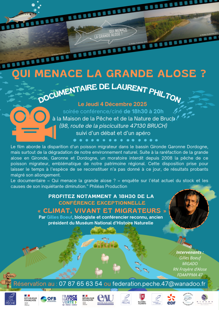 La projection sera suivie d’un échange avec les intervenants (Gilles Boeuf, Réserve Naturelle de la Frayère d’Alose, MIGADO, FDAAPPMA 47) et d’un apéro Garonne.