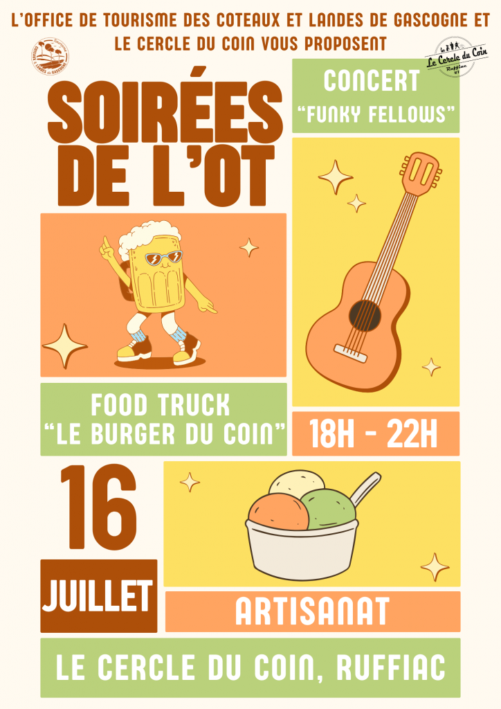Retrouvez artisans, producteurs et le Food Truck “Le Burger du Coin” à Ruffiac autour d’un concert avec les “Funky Fellows”.