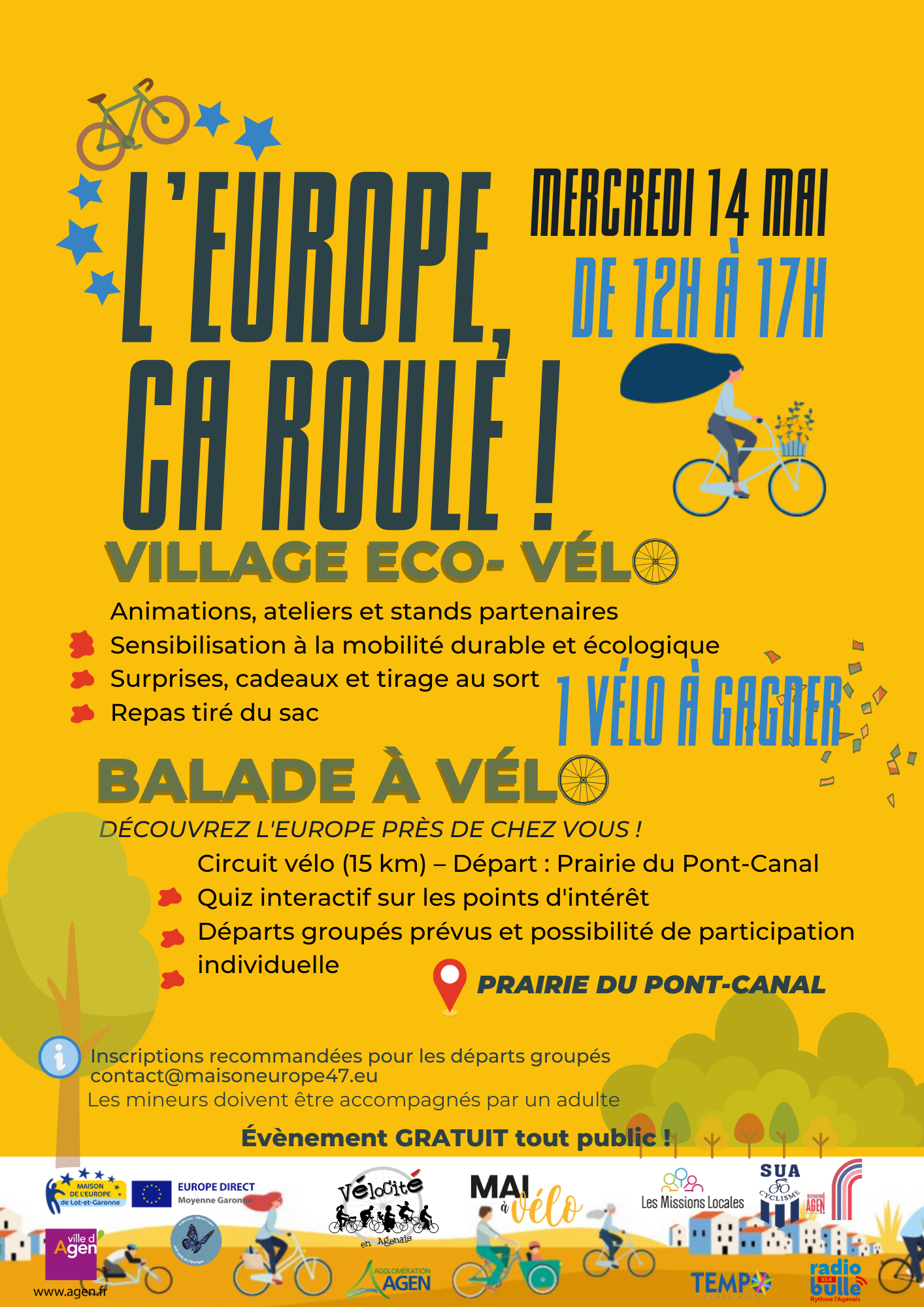 Le mercredi 14 mai, de 12h à 17h, la Maison de l’Europe de Lot-et-Garonne / Europe Direct Moyenne Garonne , en partenariat avec Vélo Cité et plusieurs acteurs locaux, vous propose un après-midi dédié à la culture vélo dans le cadre de Mai à vélo.