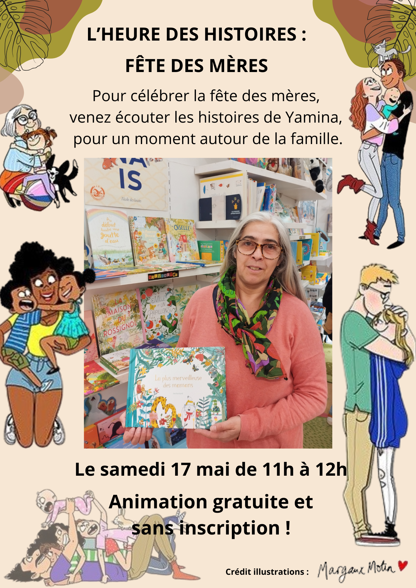 La fête des mères  approchant, notre douce Yamina donne rendez-vous à tous vos mini-lecteurs et lectrices le samedi 17 mais de 11h à midi avec plein d’histoires sur les mamans, mais aussi sur la famille en général.