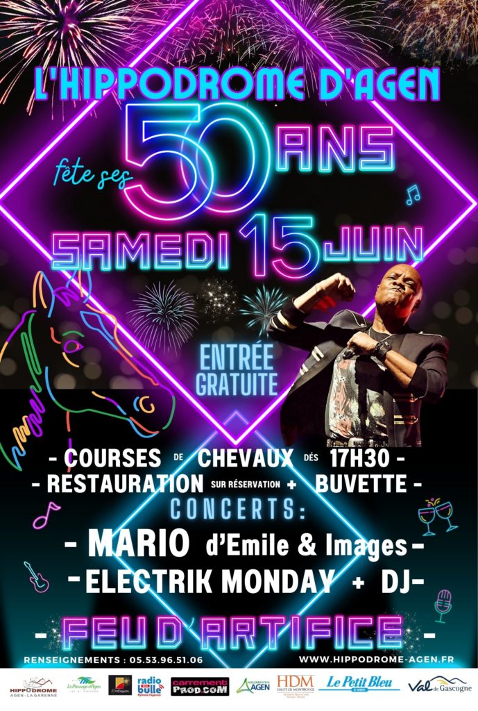 50 ans ça se fête !L’Hippodrome d’Agen vous invite à venir souffler ses 50 bougies le samedi  juin. Au programme :– Courses de Trot dès 17h15- Stands apéritifs* avec les vins et flocs Val de Gascogne, et notre partenaire bières- Repas en plein air sur réservation au 05 53 96 23 66 par Le Boeuf au GalopAssortiments de tapas (tourin de tomate glacé et magret séché – toast de foie gras mi-cuit et chutney au pruneau – madeleine de commercy au pesto – rillette de saumon au yuzu et fromage blanc acidulé) + Côte de veau du pays grillée au feu de bois, pommes de terre et crémeux de champignons + Dessert autour des fruits rouges- Banda D’Artagnan Band- Concerts avec Mario d’Emile & Images et Electrik Monday. Prolongation de la soirée au son du DJ dans un cadre insolite- Feu d’articife
