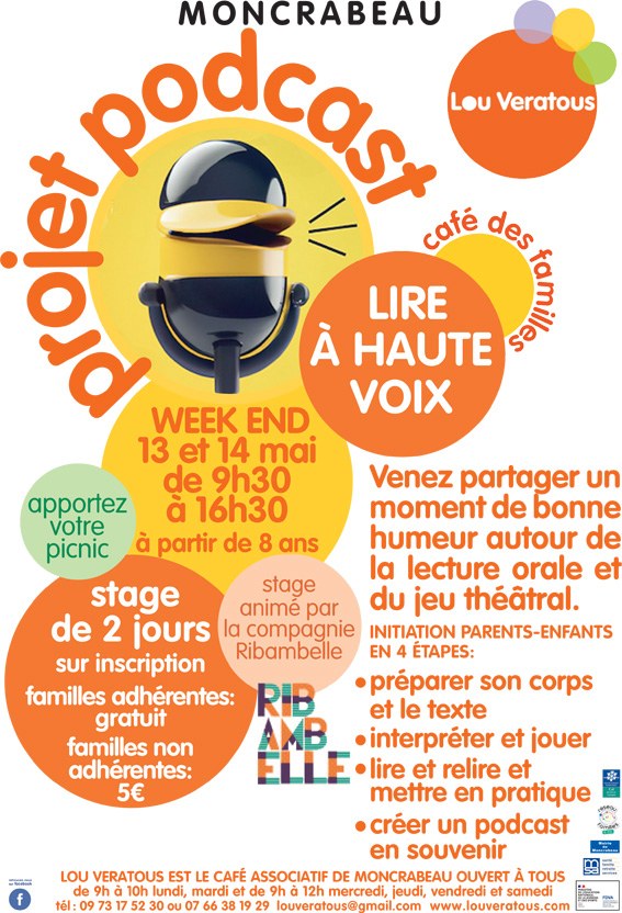 Les 13 et 14 mai, de 9h30 à 16h30, La Compagnie Ribambelle animera un stage « lecture à haute voix en famille ».