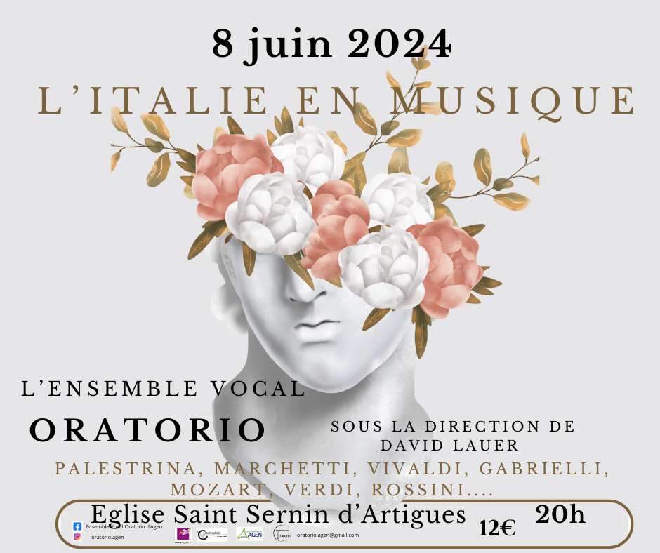 L’Ensemble Vocal Oratorio vous propose un voyage musical en Italie, de Palestrina et Vivaldi à Gabrielli, Verdi et Rossini.