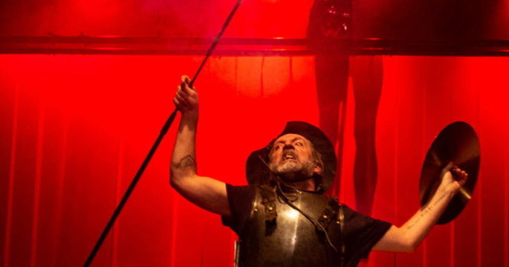 Dans cette réécriture théâtrale, Quichotte devient un « chevalier-rockeur » garant de la mémoire de toute l’Histoire et surtout de l’esprit du rock’n’roll. Il erre désormais de cellule de dégrisement en fast-food; s’égare dans des bars à hôtesses; arpente les labyrinthes hasardeux des enfers numériques; affrontant moulins et autres géants d’aujourd’hui, avec toujours vissé au corps, ce même désir d’en découdre avec l’injustice.