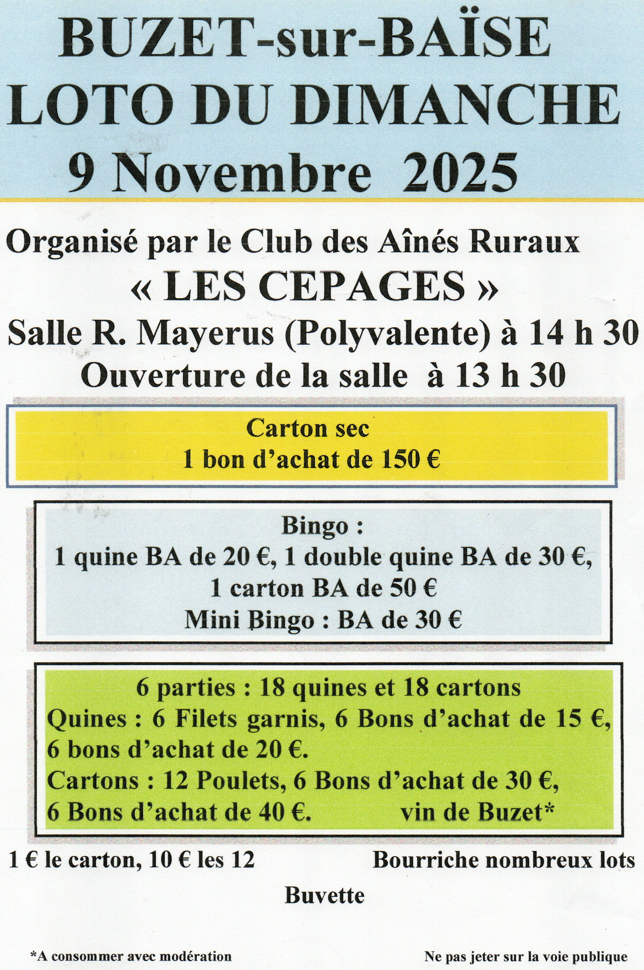 Bingo: quine BA 20€, double quine BA 30€, carton BA 50€, mini bingo BA 30€.