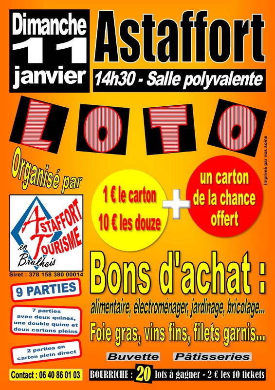 Nombreux bons d’achat (alimentaire, bricolage, jardinage…) de 15 à 200€, foies gras, vins, filets garnis… 20 lots supplémentaires à gagner à la bourriche.