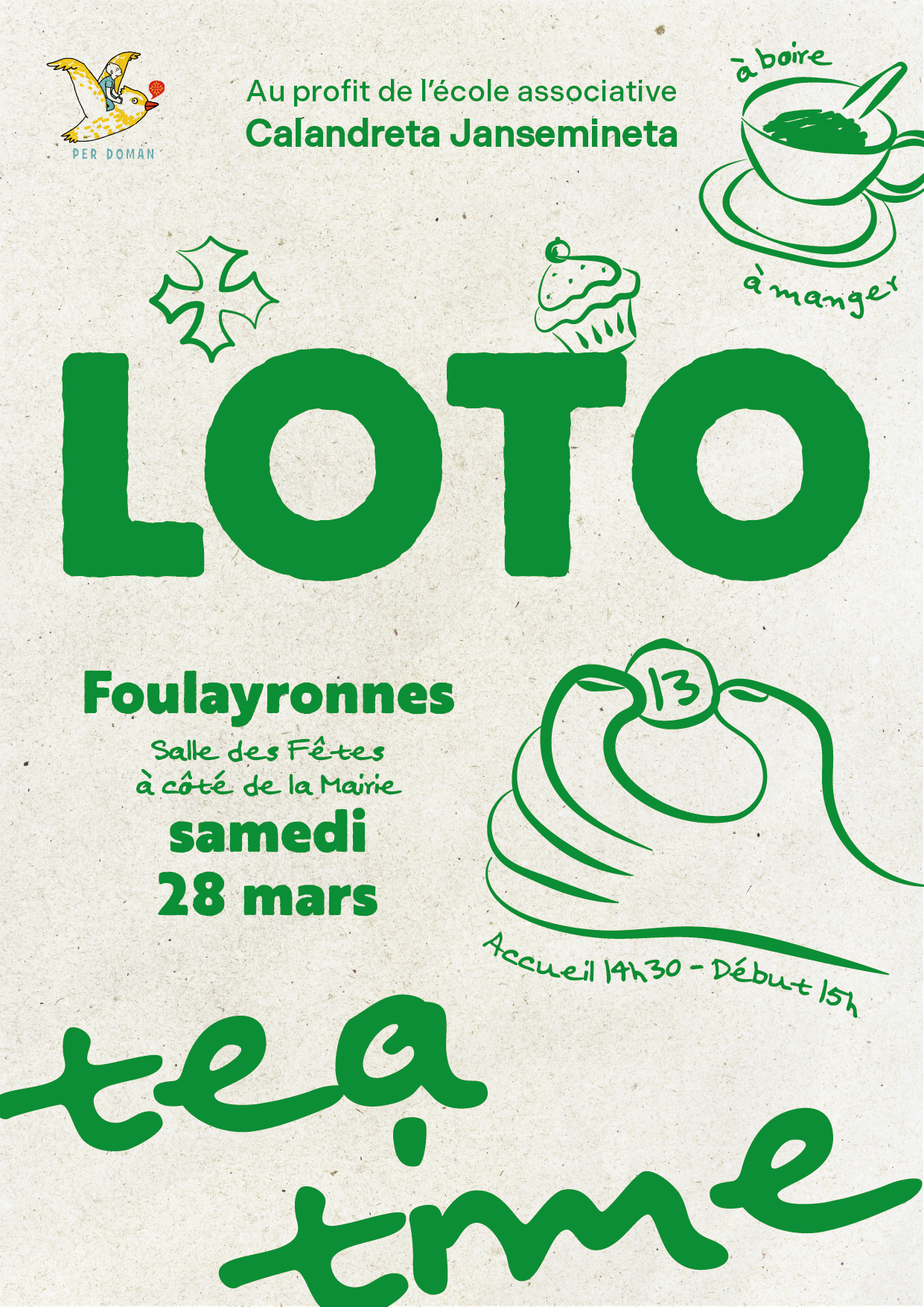 Samedi 28 mars, venez profiter d’un loto convivial et gourmand à l’ambiance Tea Time à Foulayronnes (salle des fêtes à côté de la mairie).
