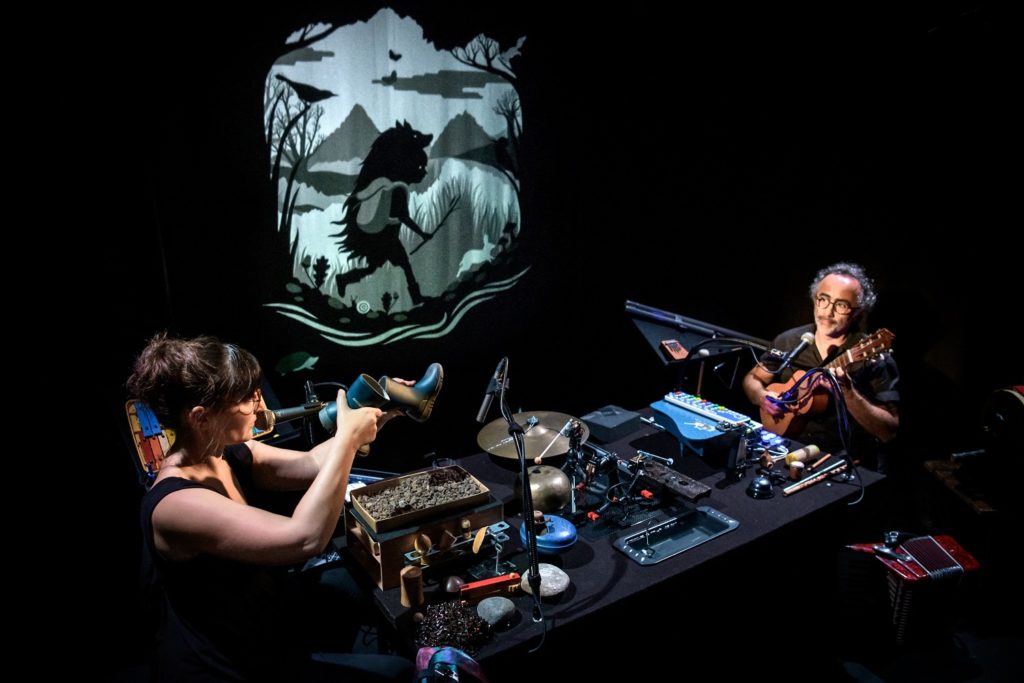 Grâce à une multitude d’objets sonores et de petits instruments, les deux musiciens font vivre Jouko, né de l’union atypique d’un ours et d’une louve.