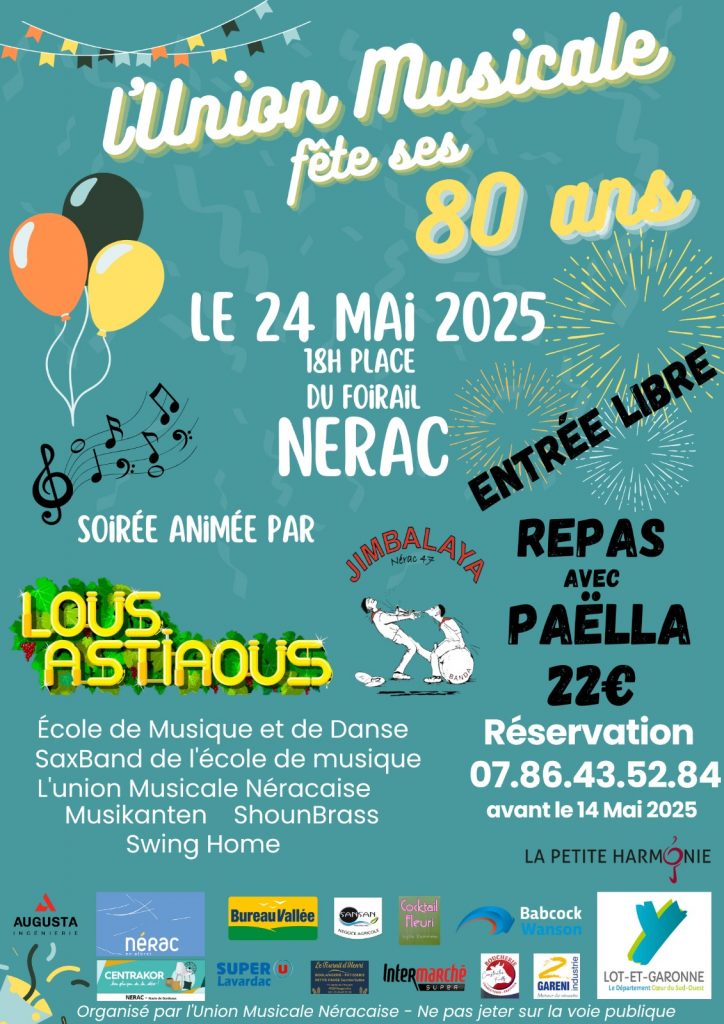 Pour cette occasion, plusieurs concerts seront donnés, avec en tête d’affiche Les Astiaous et la Jimbalaya. L’Ecole de Musique se joint à la fête, ainsi que différents groupes formés par des musiciens de l’Harmonie.