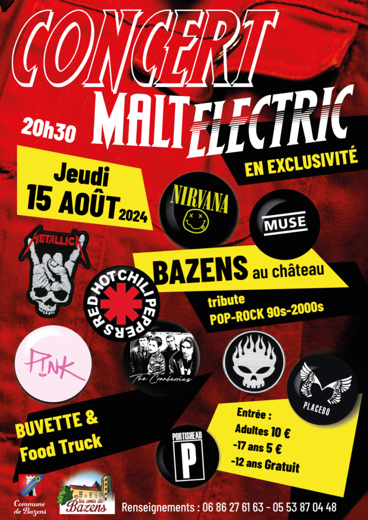 A la suite de Michel Fraisse & Co l’été dernier, un audacieux concert Pop-Rock au Château vous est proposé par les Amis de Bazens : Malt Electric avec la puissante voix chaleureuse de Laetitia et la furieuse guitare virtuose de Terence à (re)découvrir dans un nouveau répertoire de reprises de Nirvana à Portishead.