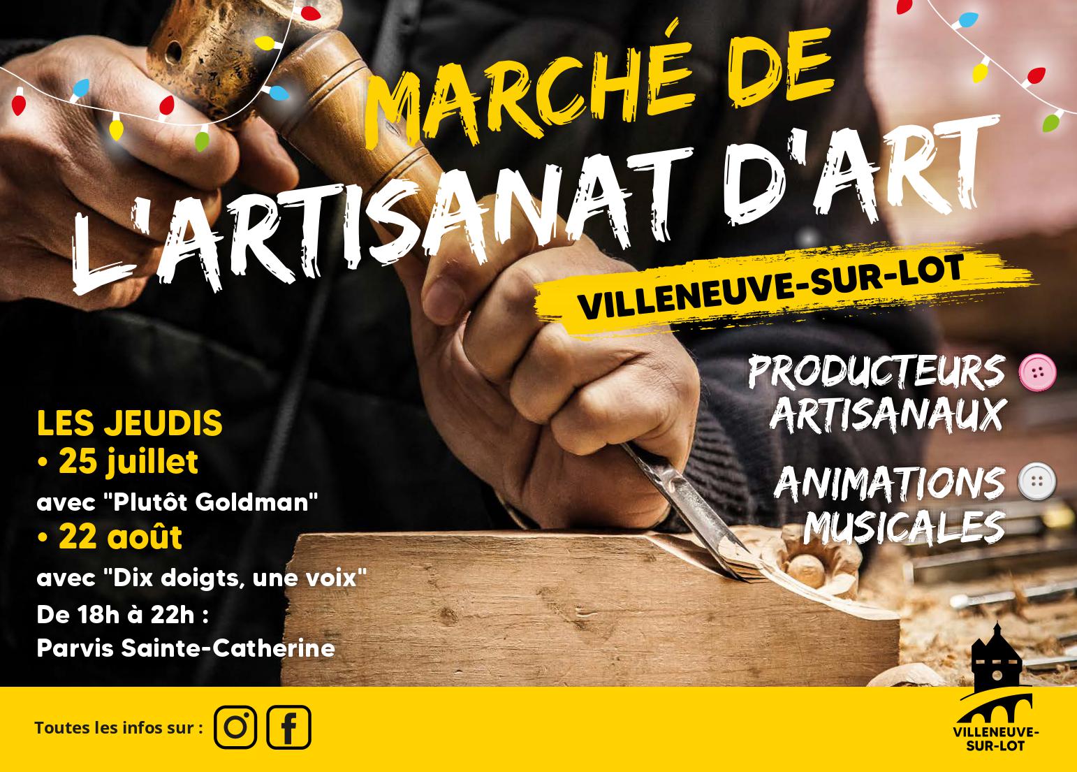 Le marché de l’artisanat d’art permet d’offrir une visibilité accrue à nos artisans locaux. Deux soirées dédiées à nos artisans pour montrer et mettre en avant leurs compétences et œuvres. Durant ce marché, il y aura également des animations musicales telles que “Plutôt Goldman” le 25 juillet et “Dix doigts, une voix” le 22 août, un duo qui fait des reprises de variété française et internationale (France Gall, Francis Cabrel, Adèle, Police, Lady Gaga, Scorpions, etc…).Ce sera l’occasion de soutenir nos artisans d’art locaux, à travers une ambiance musicale.