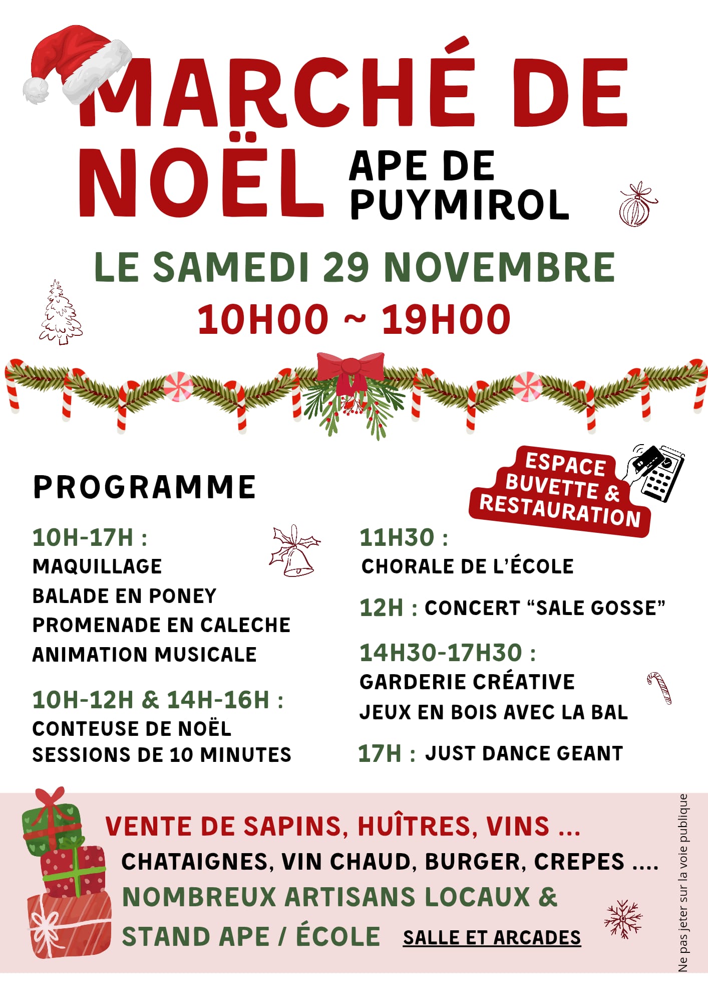 Nous vous proposons aussi de nombreuses animations: visite du Père Noël, concert ‘Sale Gosse’, chorale de l’école, conteuse de Noël, maquillage, balade en poney, animation musicales, promenade en calèche, garderie créative, jeux en bois avec la présence de la B.A.L (Brigade d’Animations Ludiques), pesée du jambon, Just Dance géant.