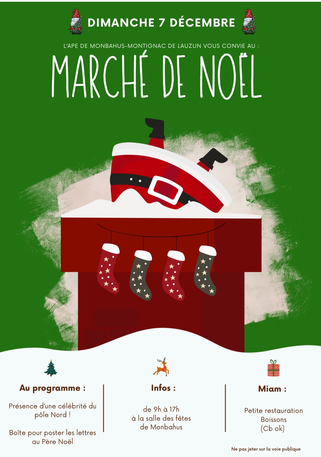 L’Association des Parents d’Elèves des écoles de Monbahus et Montignac de Lauzun vous convie à leur Marché de Noël, le dimanche 7 décembre à la salle des fêtes de Monbahus.