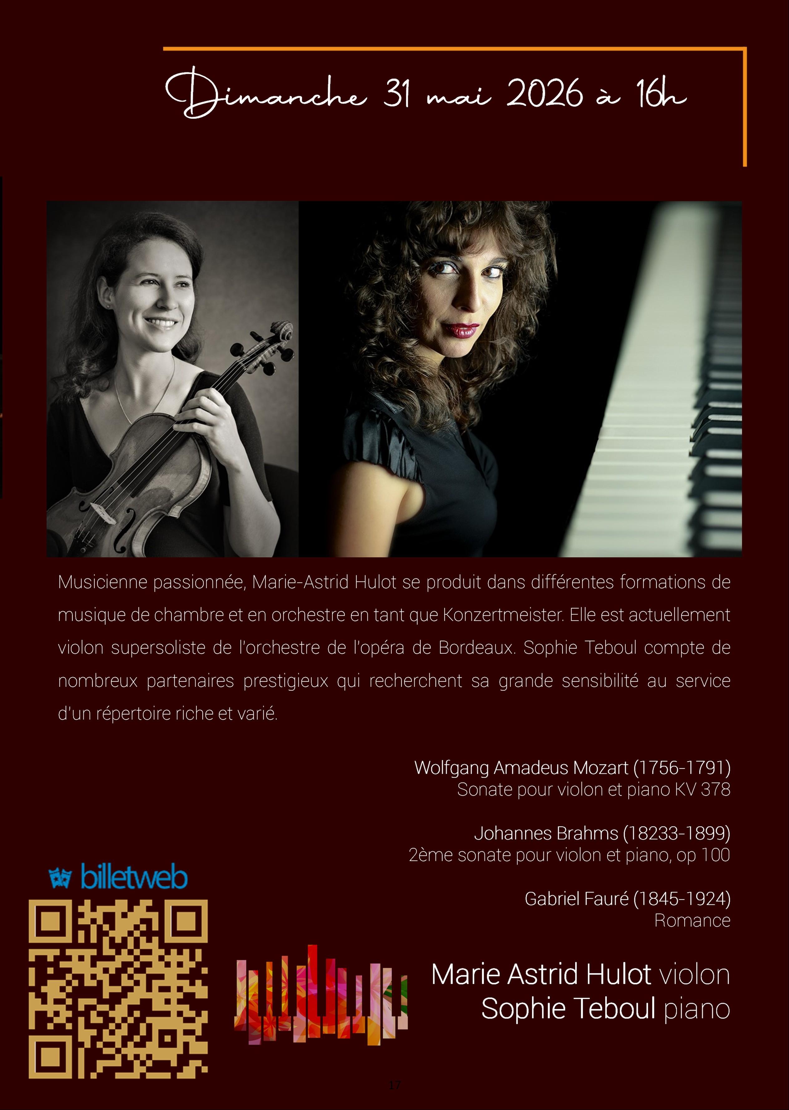 Musicienne passionnée, Marie-Astrid Hulot se produit dans différentes formations de musique de chambre et en orchestre en tant que Konzertmeister. Elle est actuellement violon supersoliste de l’orchestre de l’opéra de Bordeaux.