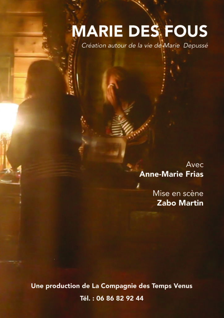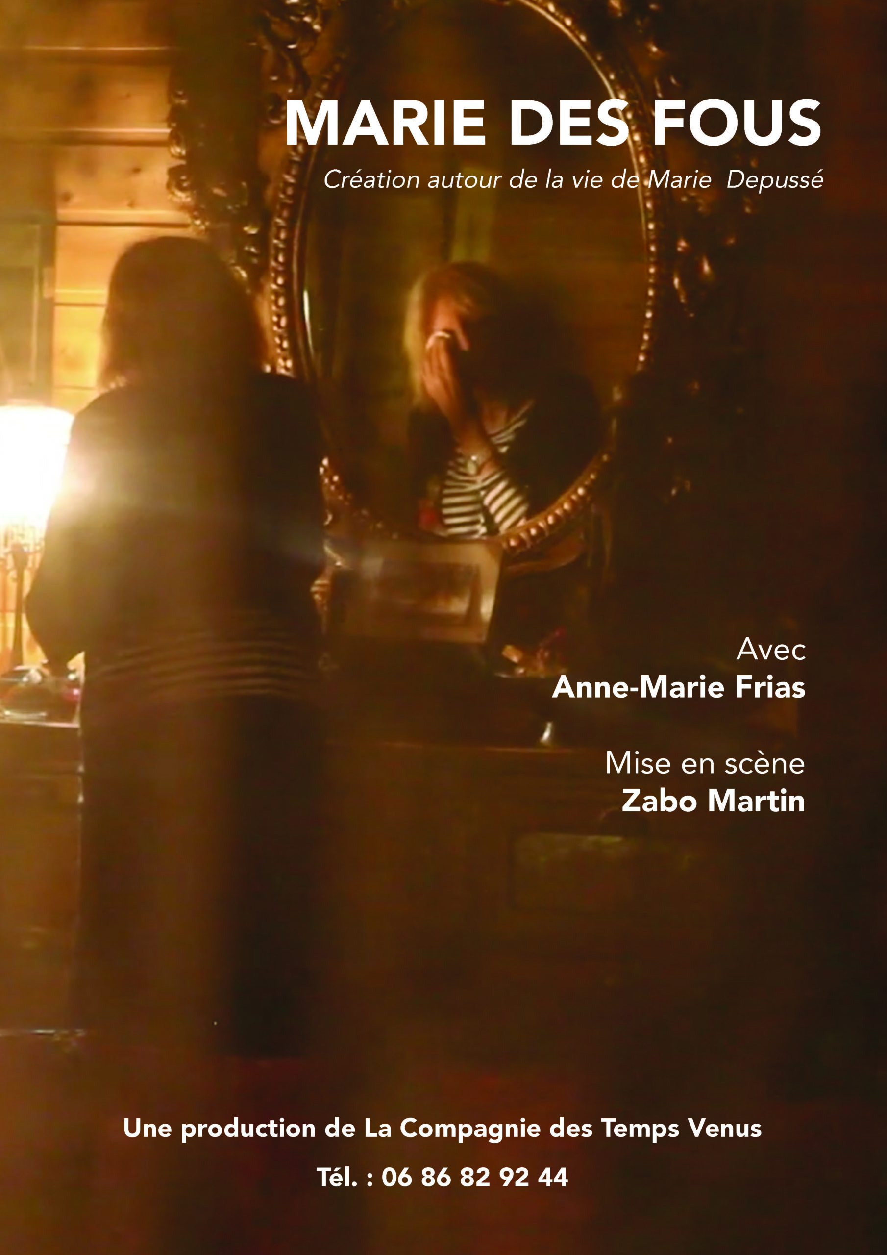 La pièce« Marie des fous », raconte la vie, incroyablement riche et intense de Marie Depussé, agrégée de lettres, enseignante à Paris VII qui, dans le même temps, travaillait en tant que psychanalyste à la Clinique psychiatrique de Laborde, dirigée par Jean Oury. Intriguée par « le vent de liberté et de tolérance qui circulait dans ce château expérimental », elle s’installa dans un chalet, dans le parc du château, où elle recevait ceux qu’elle appelait «les chevaliers de la cabane», les fous de Laborde.Ce spectacle intimiste, dans lequel Anne-Marie Frias interprète Marie Depussé, nous interroge, nous émeut, nous fait sourire aussi. « Marie des fous » nous rappelle que ce sont les liens qui créent un lieu, que l’expérience se doit d’être vagabonde, que le temps est nécessaire aux transformations, qu’il faut être créateur d’espaces d’accueil où la parole puisse advenir. Felix Guattari qui a travaillé et « pensé » cette communauté thérapeutique dès le début avec Jean Oury, écrivait à la fin de sa vie : « Aujourd’hui, on est revenu à des années d’hiver de la psychiatrie. J’espère que le balancier de l’histoire fera, un jour prochain, son œuvre, et qu’entretemps ce qui aura été conquis restera et permettra des avancées plus substantielles. »Marie Depussé, une femme de l’Etre qui aimait les fous.