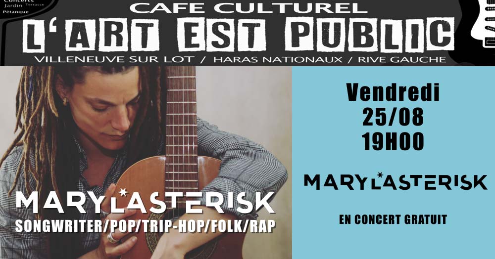Au corps à corps avec sa guitare, c’est dans la langue de Molière et parfois même dans une langue inconnue que Mary L*Asterisk nous livre ses textes intimistes et son regard sensible sur le monde.