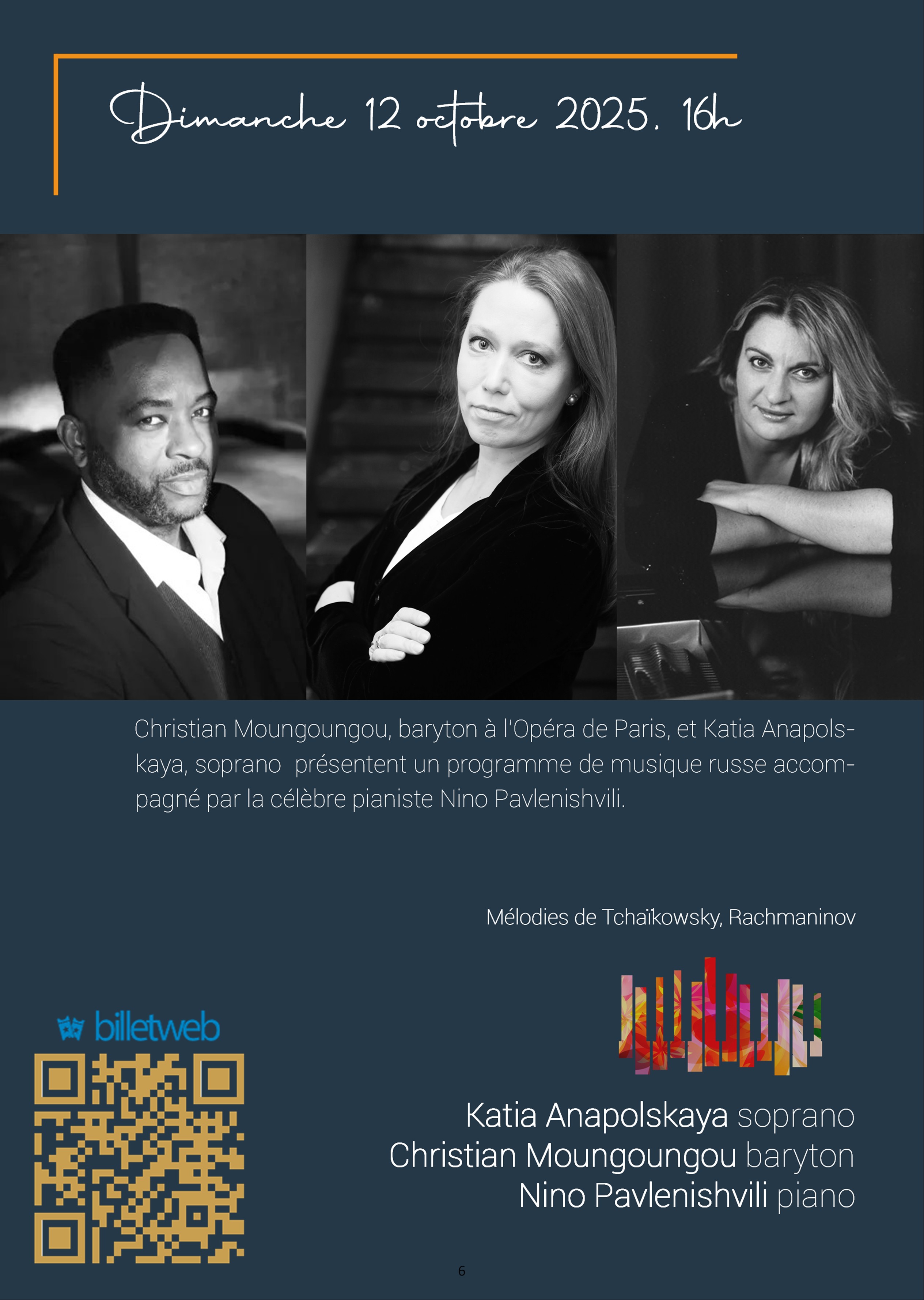 Christian Moungoungou, baryton à l’Opéra de Paris, et Katia Anapolskaya, soprano, présentent un programme de musique russe accompagné par la célèbre pianiste Nino Pavlenishvili.