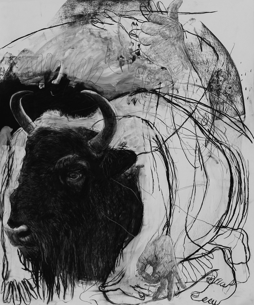 « Un cortège de dessins et volumes pour faire surgir l’animal du support, une suite de métamorphoses passées, en cours et à venir, la série d’un bestiaire préhistorique d’animaux disparus conviés à montrer leurs tentatives de réinvention. Le papier s’invente paroi nomade, comme le relevé nécessaire de leurs présences sourdes et sauvages. L’aventure des mains pour voir à travers leurs yeux, étonnés d’un corps souple et libre. L’apparition de chimères en devenir. Le voyage et la trace des mines et des fusains pour en cerner et ouvrir les contours. Voici ainsi ces pistes d’explorations, formes d’autoportraits sans visage, résolument manuelles. Des natures mortes au noir pour lire l’animal qui est en soi. Travaux sur papier de tous formats, fusain, pierre noire et encre dialoguent avec des volumes en bois, zinc, plâtre, terre. » Benjamin Bondonneau
