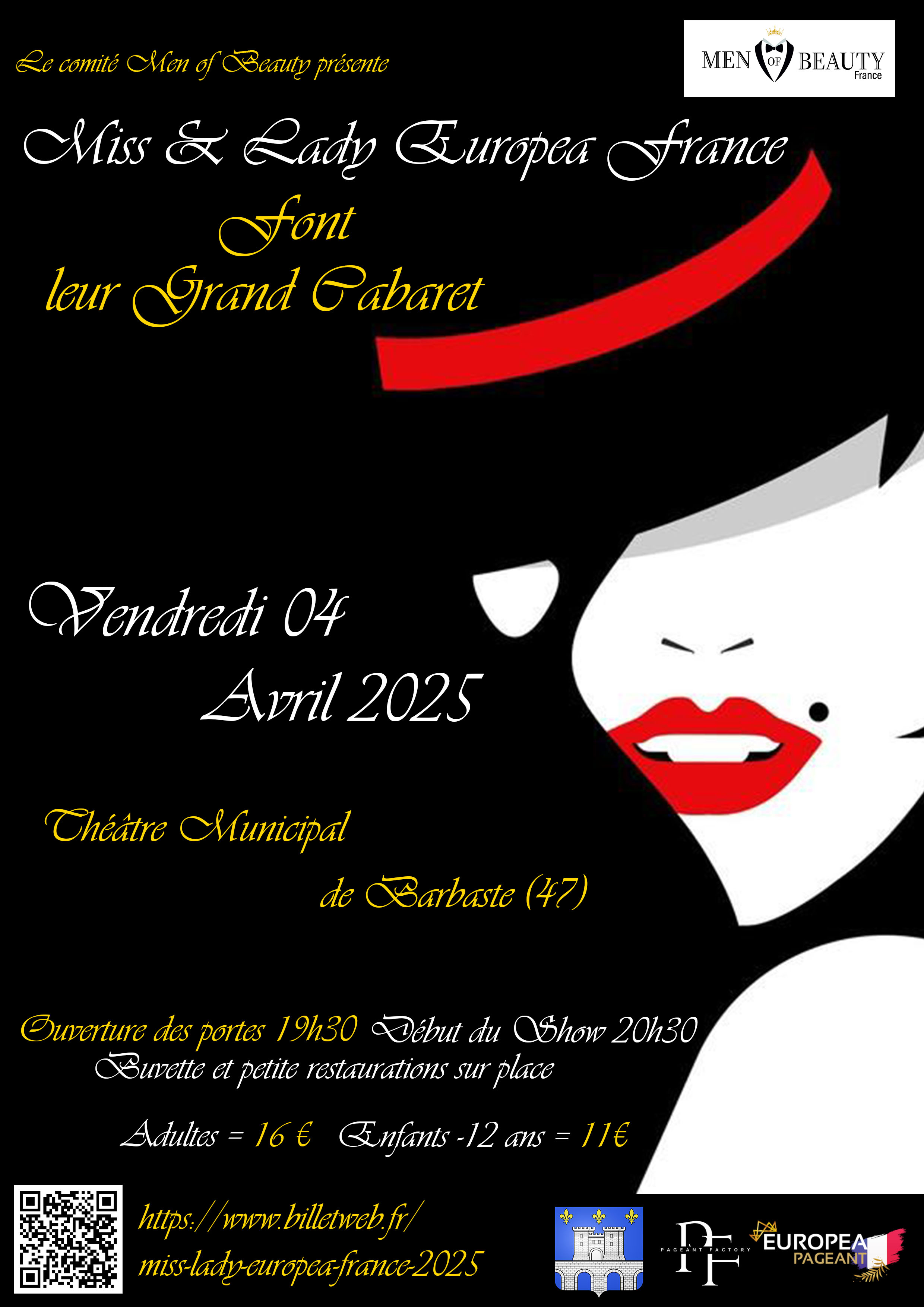 Venez assister à Miss et Lady Europea France 2025 qui se tiendra le vendredi 4 avril 2025.