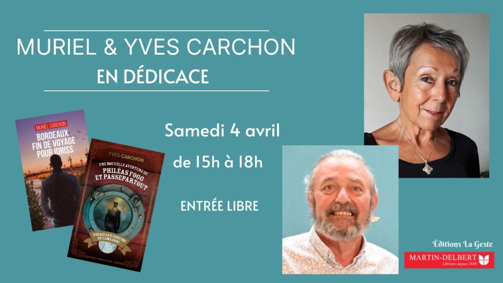 𝐒𝐚𝐦𝐞𝐝𝐢 𝟒 𝐚𝐯𝐫𝐢𝐥 𝐝𝐞 𝟏𝟓𝐡 𝐚̀ 𝟏𝟖𝐡 retrouvez 𝐌𝐮𝐫𝐢𝐞𝐥 𝐂𝐚𝐫𝐜𝐡𝐨𝐧 qui dédicacera Bordeaux fin de voyage pour Idriss aux éditions La Geste, ainsi que 𝐘𝐯𝐞𝐬 𝐂𝐚𝐫𝐜𝐡𝐨𝐧 qui dédicacera Une nouvelle aventure de Phileas Fogg et Passepartout – Voyage aux confins de l’Amazone aux éditions La Geste.