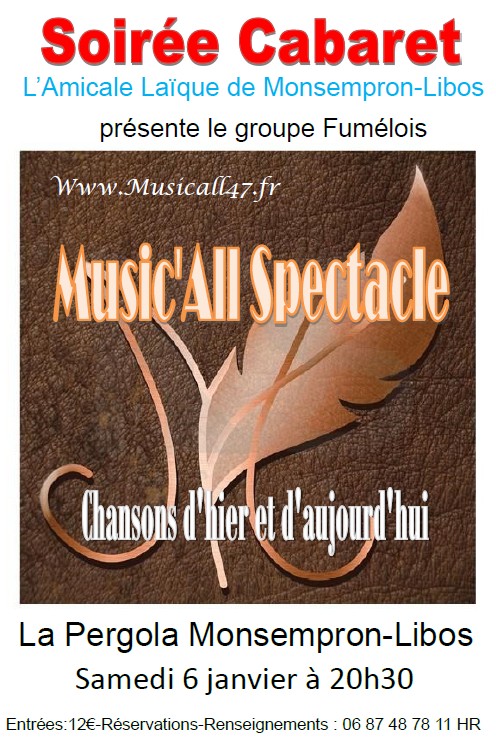 Spectacles Music’All Spectacle Spectacle musical salle de La Pergola - Monsempron-Libos 37 Rue Nationale Monsempron-Libos Voir tous les événements se déroulant ici le 6 janvier 2024 20h30 12€ Site internet Soirée Cabaret proposée par l’l’Amicale Laïque. Amicale laïque de Monsempron-Libos 06 87 48 78 11 simonpier@wanadoo.fr