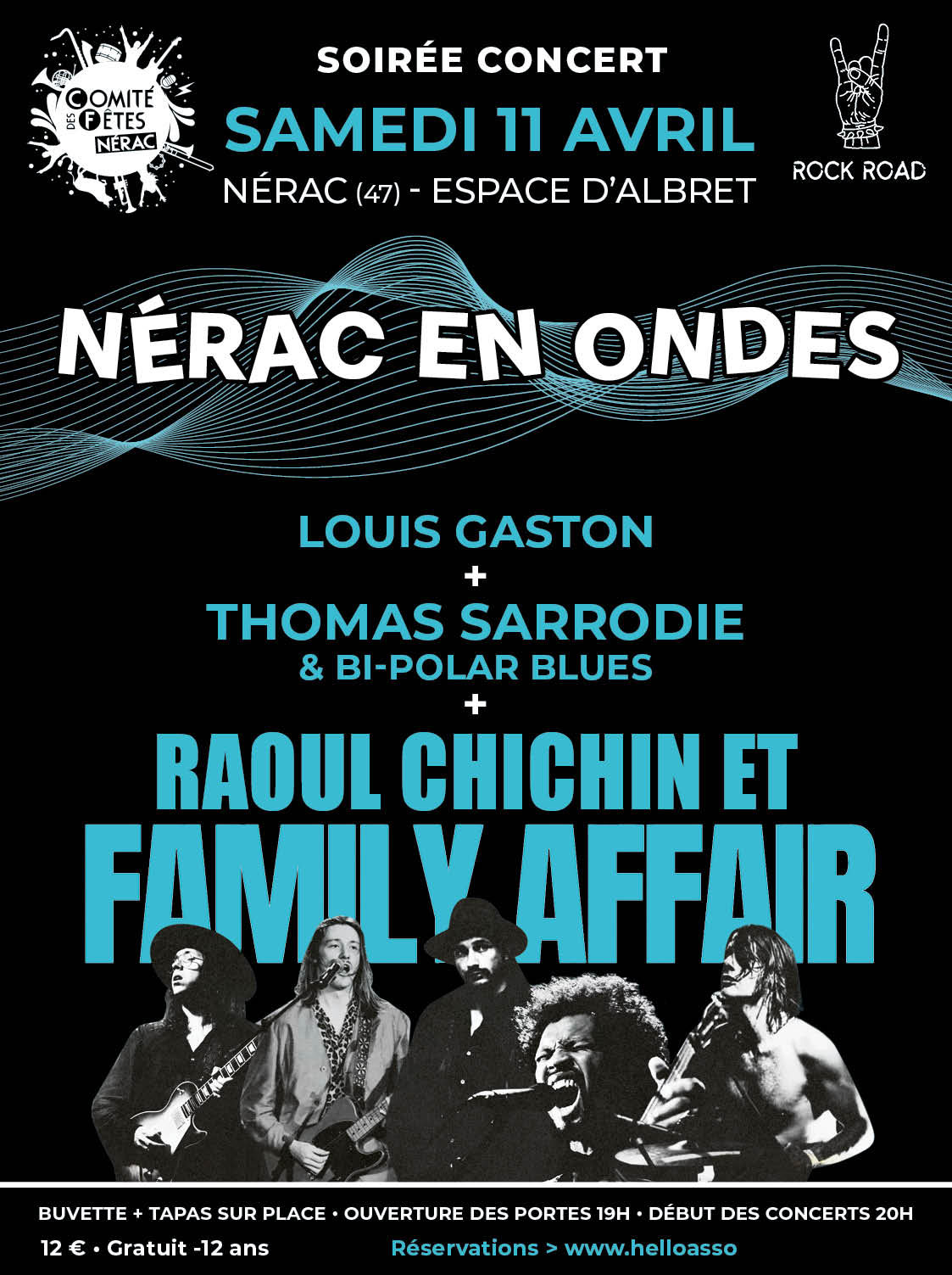 Soirée concert organisée par le Comité des Fêtes de Nérac et l’association Rock Road qui assure la programmation artistique.