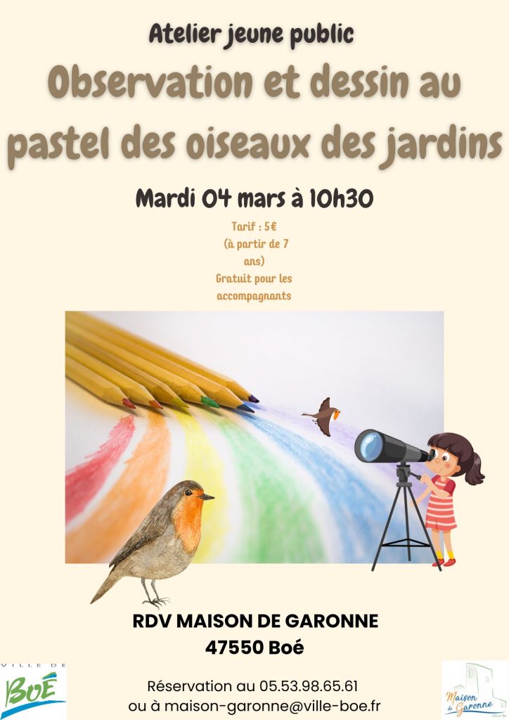 Après un temps d’observation et de détermination en extérieur des oiseaux des jardins à la longue-vue, cet atelier vous propose de les dessiner aux crayons pastels.
