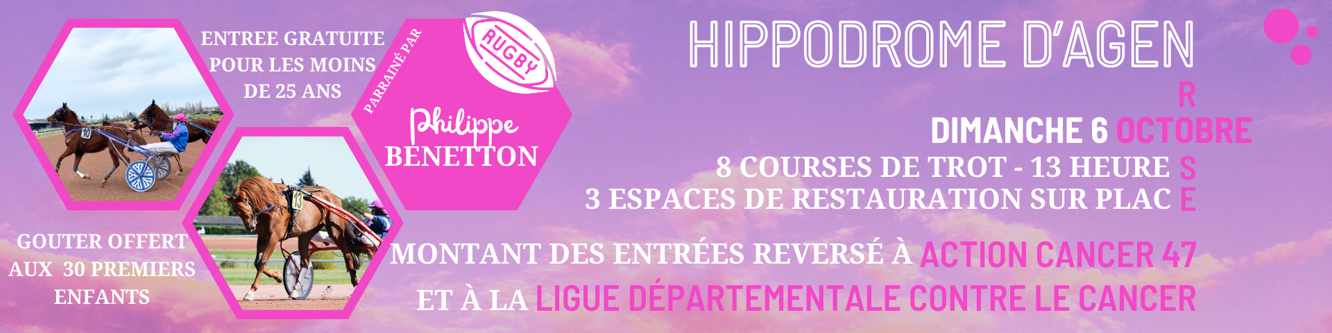 L’Hippodrome d’Agen accueillera, à l’occasion de sa réunion de courses hippiques de dimanche 6 octobre un événement caritatif au profit de la Action Cancer 47 et Ligue Départemental contre le Cancer pour son opération Octobre Rose et la prévention du cancer du sein.