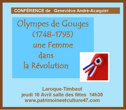 Pour cette dernière conférence du premier semestre 2025 l’association Patrimoine et Culture a invité Geneviève André-Acquier, membre de l’Académie de Montauban, docteur ès lettres Paris Sorbonne pour nous présenter une figure féminine en la personne d‘Olympe de Gouges née à Montauban en 1748 qui s’est illustrée dans la tourmente révolutionnaire.