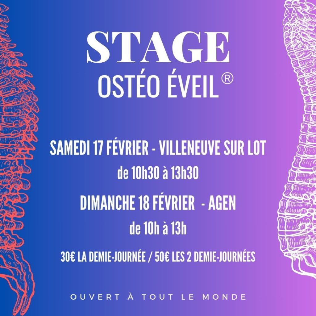 ‘ ́ ́ ® ?Approche avant-gardiste créée par Michèle Tarento, médecin, ostéopathe, danseuse et chorégraphe, l’ostéo éveil crée un pont entre des pratiques perceptives subtiles et les recherches scientifiques les plus récentes (ostéopathie, embryologie, fascias, biotenségrité,…) sur le corps et la matière vivante.L’apprentissage de l’ostéo-éveil permet de :- développer des sécurités physiques durables,- approfondir la connaissance de soi et- élargir sa palette créative.L’exploration du squelette et de la matière osseuse à travers le réveil osseux® est un préalable de l’ostéo-éveil, ouvrant la porte à l’exploration des autres matières du corps: fascias, organes, cavités,…Peu à peu les différents touchers se mettent en place et les perceptions s’affinent: on se situe de plus en plus précisément dans la matière vivante (sur soi et sur l’autre).Cela entraîne la déconstruction de croyances corporelles et la mise en place progressive d’une approche écologique du corps qui modifie notre rapport à soi, à l’autre, au monde et à la création.Le travail corporel profond et subtil permet l’émergence d’improvisations poétiques et inédites. : – Samedi matin de 10h30 à 13h30 à Villeneuve-sur-Lot, au Centre Culturel, salle de danse au 2ème étage. Ouverture des portes à 10h. – Dimanche matin de 10h à 13h à Agen, au 61 rue Gérard Duvergé. Ouverture des portes à 9h30. ? – ̀ !Professionnel.les de santé, thérapeutes manuels – ostéopathes, kinésithérapeutes, chiropracteurs -, danseur.ses – en particulier les danseur.ses de contact improvisation, sportifs, praticiens somatiques, yoga, Feldenkrais, qi gong, BMC, Pilates… et toutes les personnes souhaitant optimiser leur relation au corps en terme de conscientisation, d’autonomie et de confort.Aucune connaissance préalable n’est requise.