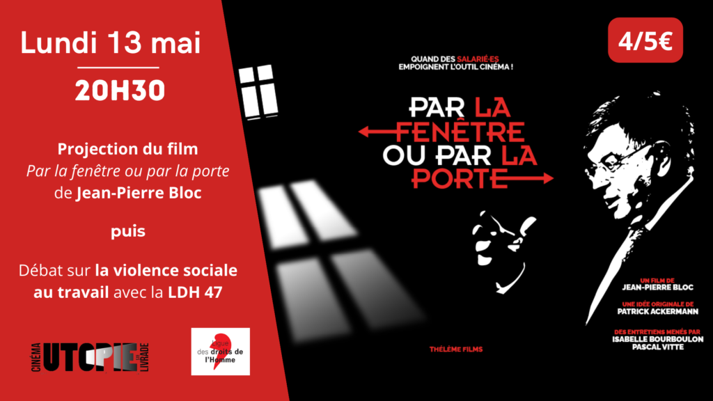 Projection du film documentaire Par la fenêtre ou par la porte de Jean-Pierre Bloc, suivi d’un échange avec La Ligue des Droits de l’Homme 47 autour de la violence sociale au travail.