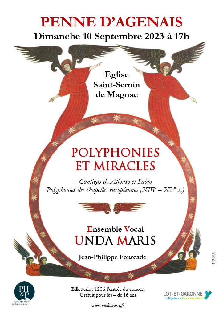 Le programme « Polyphonies et miracles » vous permettra d’entendre quelques Cantigas d’Alphonse le Sage, roi de Castille et Léon au XIIIème siècle, d’inspiration multiple: grégorien, chant de troubadour ou arabo-andalous… Les chants polyphoniques (XIVème et XVème) ont souvent été écrits pour des chapelles princières.