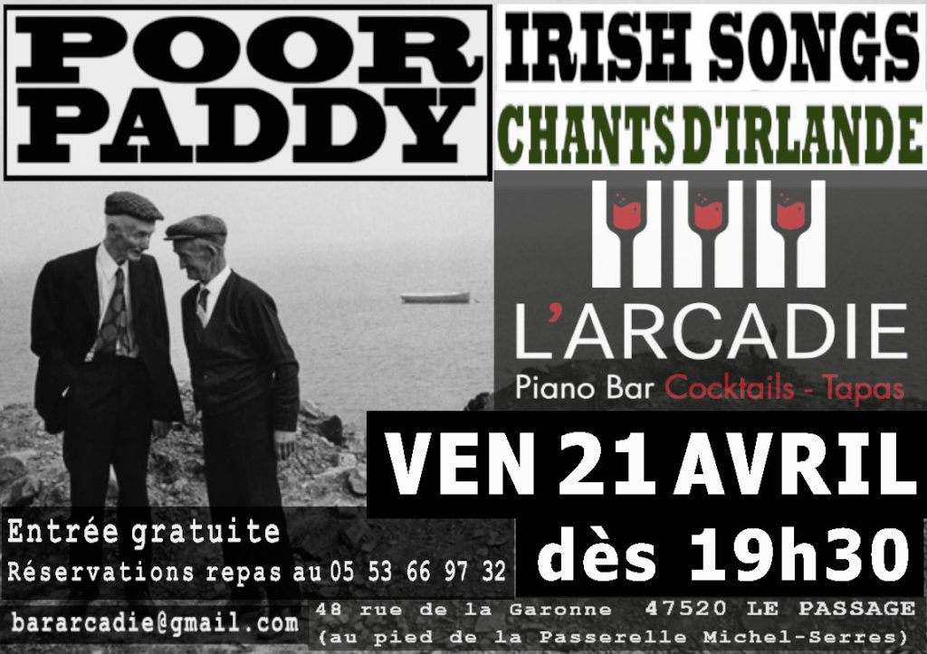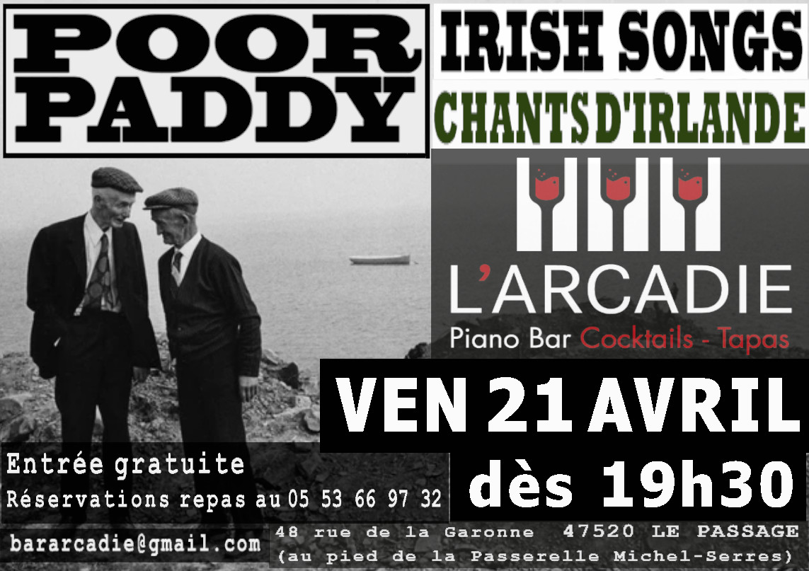 Soirée avec ambiance pub irlandais au bar l’Arcadie, au pied de la Passerelle, côté Le Passage. Chants et ballades d’Irlande par le groupe Poor Paddy.