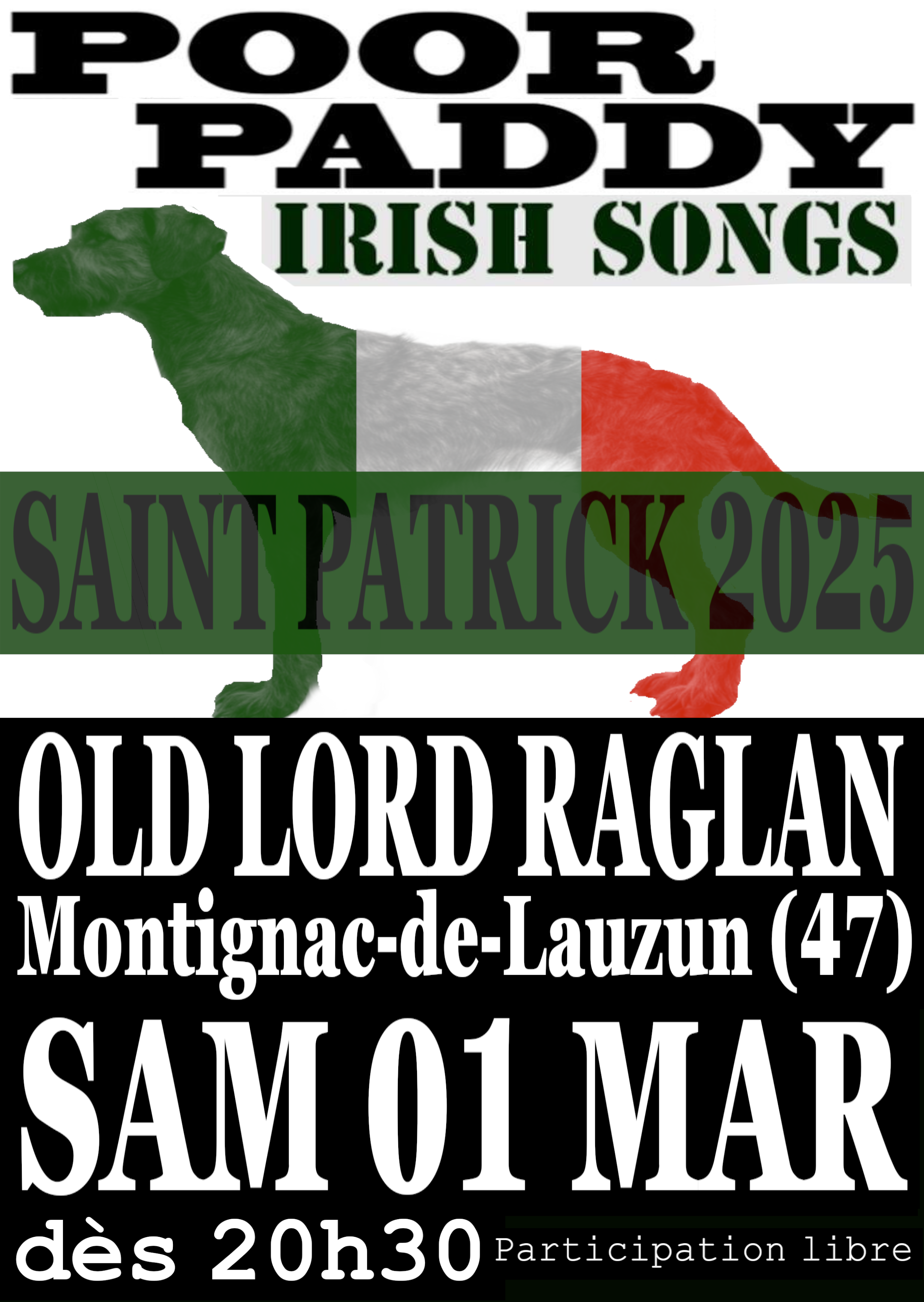 Première sortie du mois de la Saint Patrick pour le groupe de folk irlandais Poor Paddy. Ils joueront en mode ‘trio’ (comme les feuilles d’un trèfle) dans le pub le plus authentique du 47 : The Old Lord Raglan.